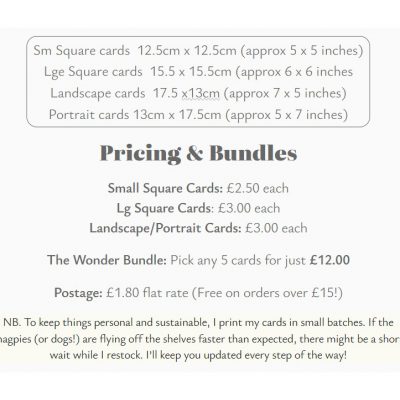 NB. To keep things personal and sustainable, I print my cards in small batches. If the magpies (or dogs!) are flying off the shelves faster than expected, there might be a short wait while I restock. I’ll keep you updated every step of the way!
